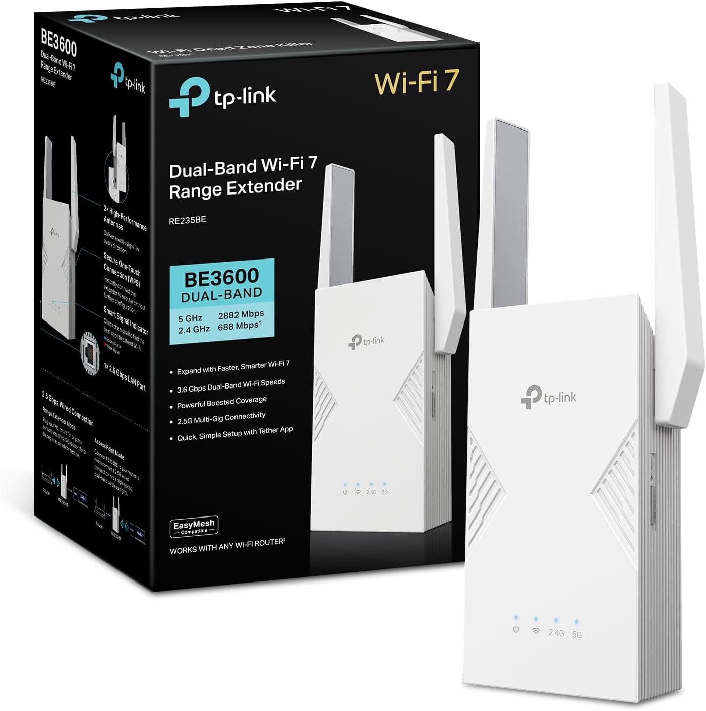TP-Link BE3600 WiFi 7 Range Extender (RE235BE), Dual Band Signal Booster for Home, up to 3.6 Gbps, 2.5G Ethernet Port, EasyMesh/OneMesh Support, Access Point Mode, Compatible with All WiFi Routers