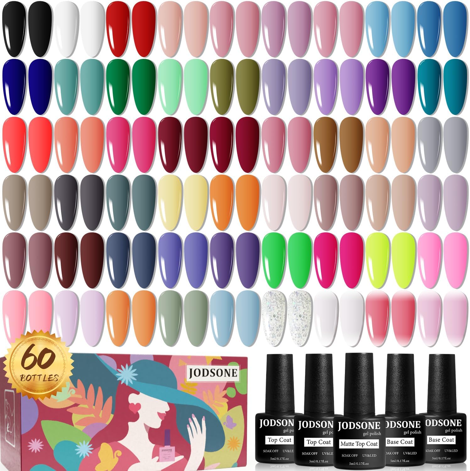 JODSONE Gel Nail Polish kit 60 PCS with 5 Bottles of Base and Glossy Matte Top Coat Soak off Gel Nail Set Suitable for All Seasons Polish Gifts