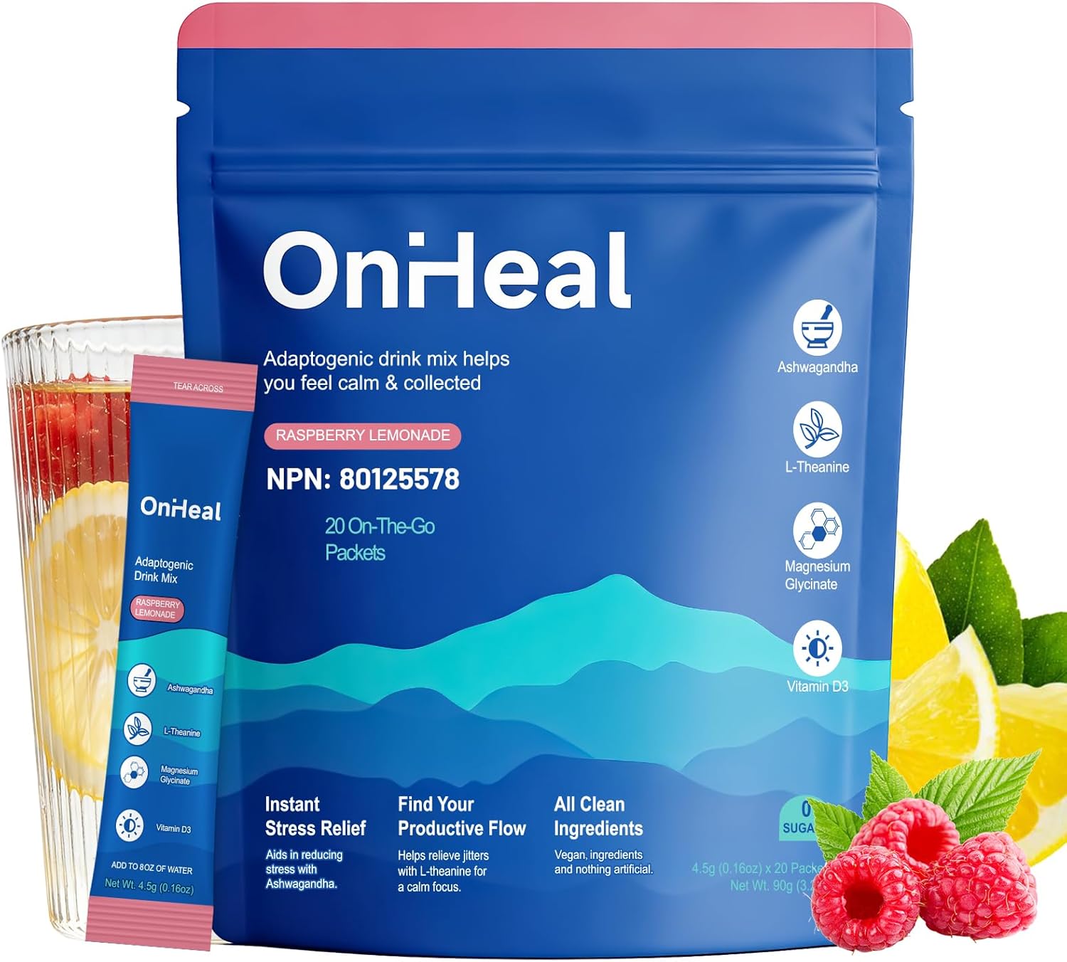OnHeal Super Cortisol Drink with Magnesium Glycinate, Ashwagandha, L-Theanine, Vitamin D3, Magnesium Powder for Sleep & Stress Relief, Raspberry Lemonade (30 Servings)
