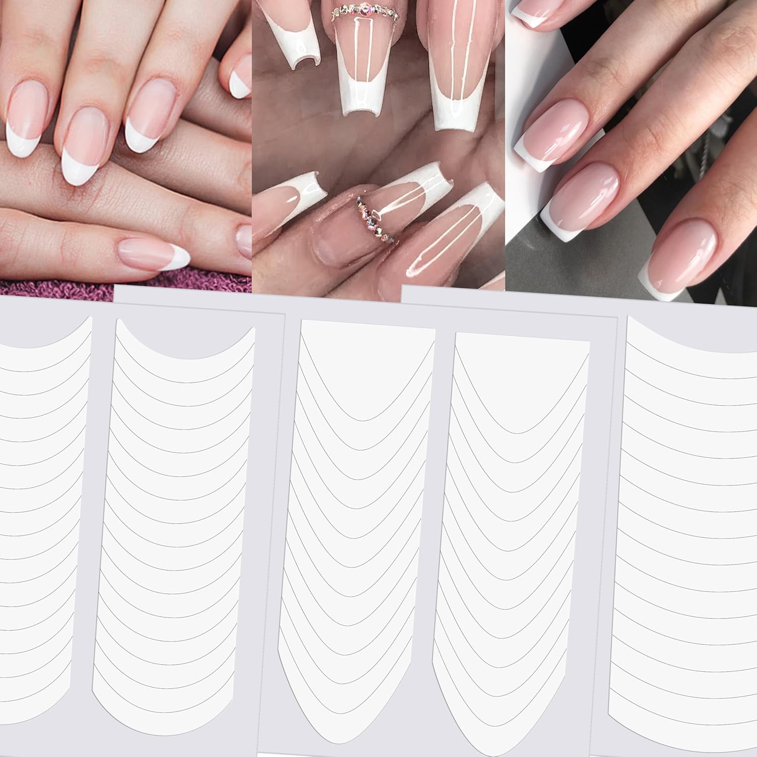 French Tip Nail Stickers, 90 Sheets 3420 Pieces Manicure Strips, 3 Designs Self-Adhesive Moon Shaped Tip Stickers Guide for DIY Decoration